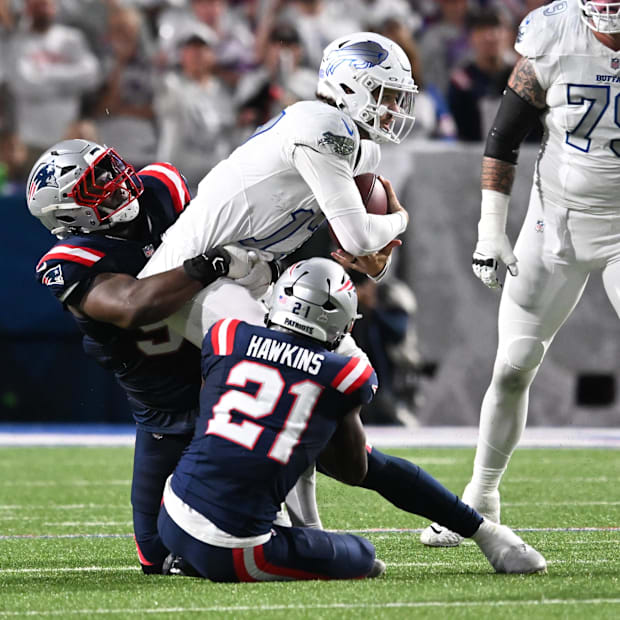 Allen was credited for two of the mistakes. He collided with tight end Dawson Knox on mistimed ball-handling error for a fumble in the first quarter. That snapped a streak of not losing a fumble that extended to almost 700 snaps. The next fumble - by receiver Keon Coleman after a short catch inside Buffalo's 10-yard line - came just five plays later. Allen then threw late and over the middle of the field and Pats' cornerback Marcus Jones picked it off at New England's 10 to spoil a prime scoring opportunity.
